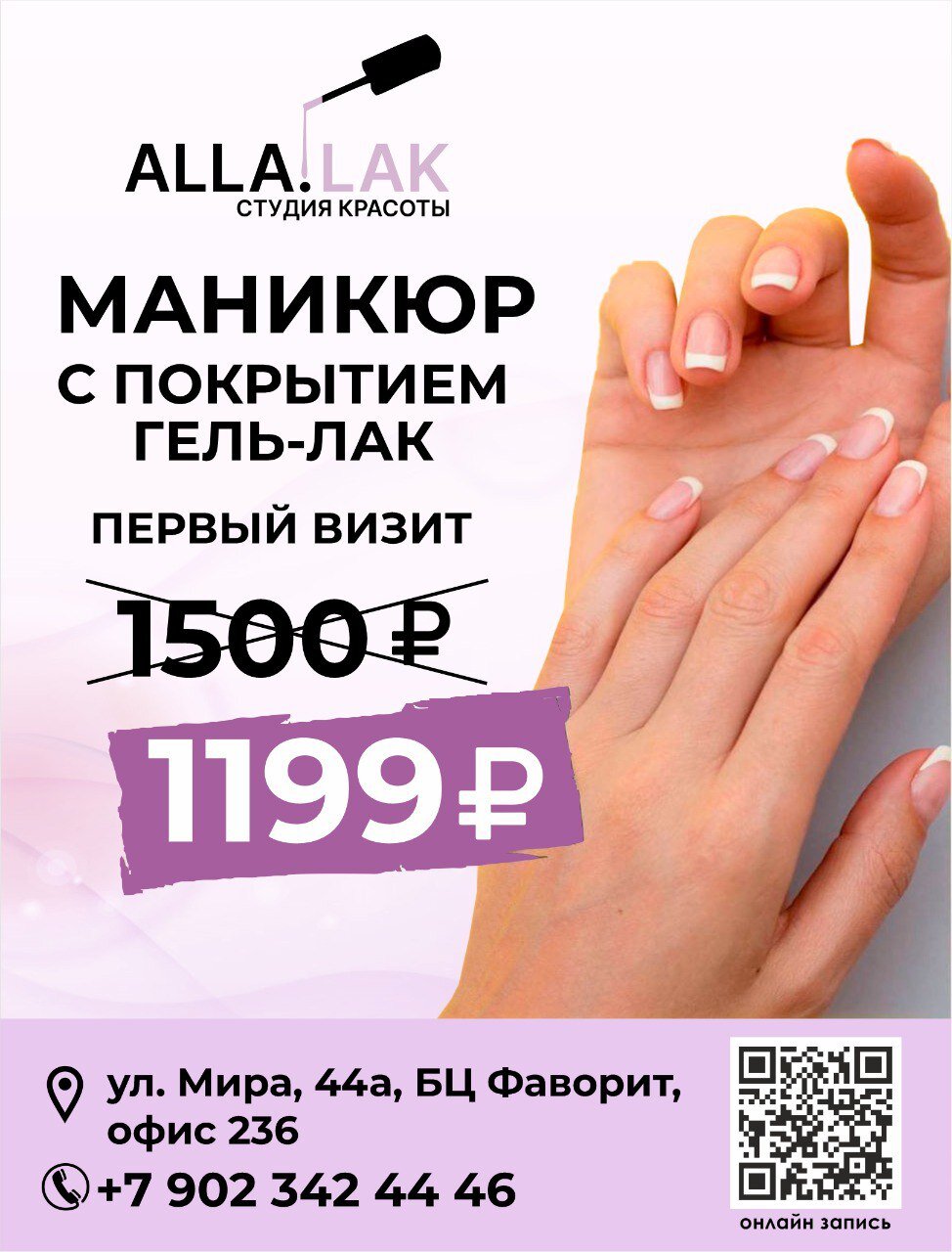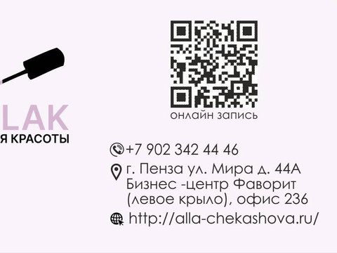 Что такое красота? В студии красоты Alla.Lak мы считаем, что это прежде всего радость и легкость! Как ни печально, но для многих современных людей, занятых карьерой и повседневными делами, уход за собой превращается в обременительную работу, которая не приносит никакой радости, но которую они вынуждены выполнять, чтобы хорошо выглядеть. Разрешите мастерам Студии красоты Alla.Lak позаботиться о вашем внешнем виде - и вам непременно принесет радость как процесс, так и результат!
